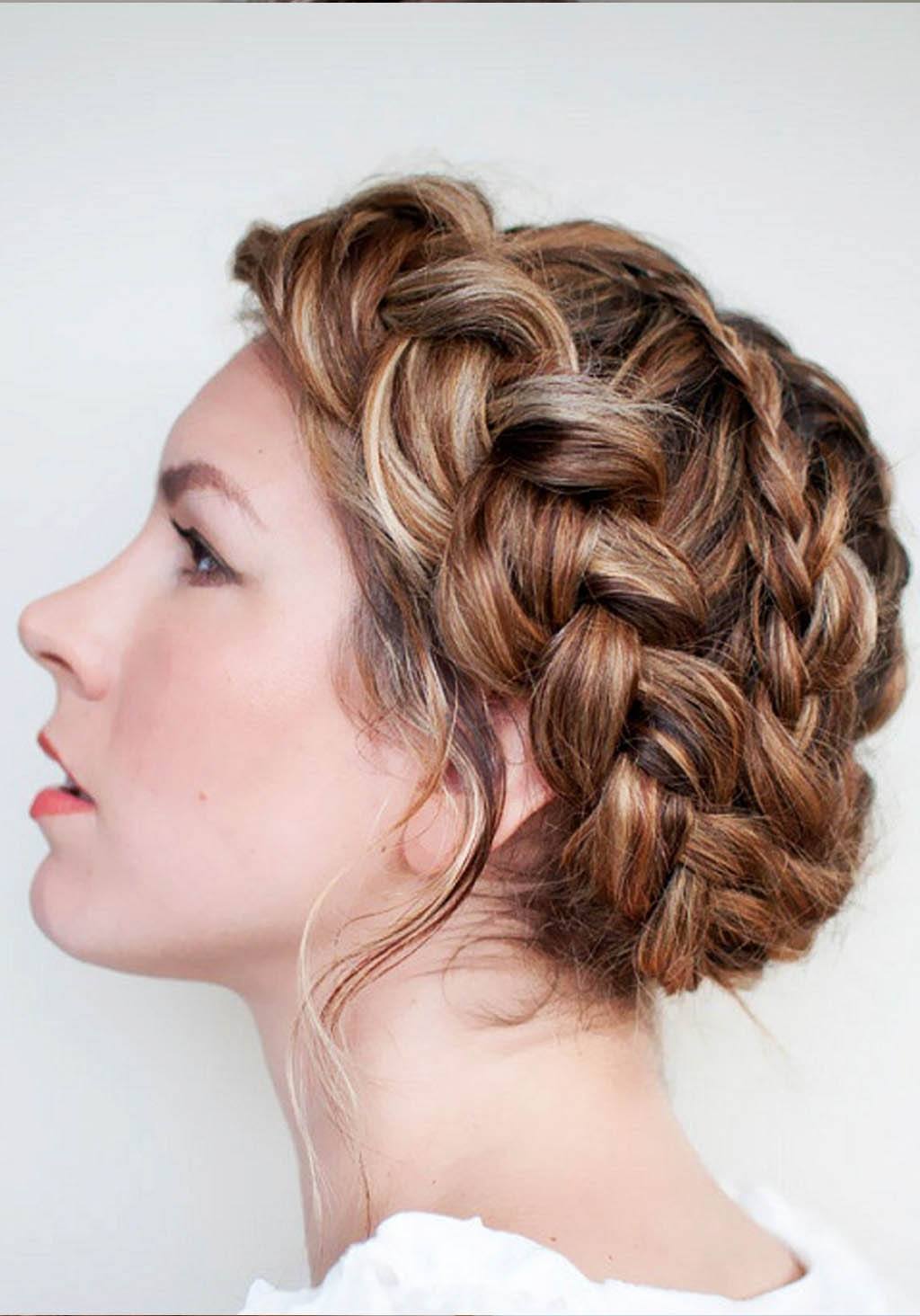Разделите волосы на две одинаковые части. Из одной половины заплетите простой колосок, делая мягкие пряди и почти не стягивая их. Со второй половиной делается то же самое, но плетение более тугое. Тугой косой обмотайте голову, как ободком, вторая будет располагаться сзади нее. Зафиксируйте прическу невидимками.