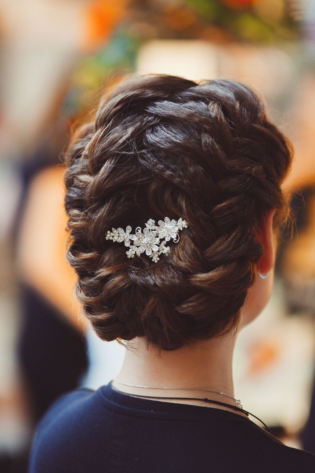 - Закрутите большую косичку вокруг её основы, закрепляя при этом невидимками. Конец с резинкой спрячьте под косой.