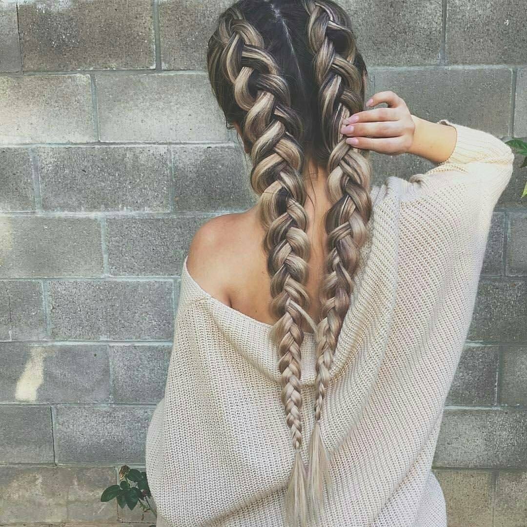 - На средние волосы заплетите одну косу у основания другой, спрятав концы. Проделайте то же самое со второй косой.