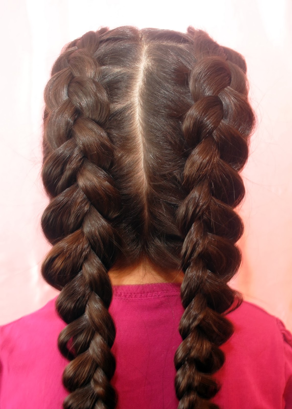- Собрать два хвоста вверху. Каждый хвостик поделить на 3 части, сплести 3 тонкие косички.