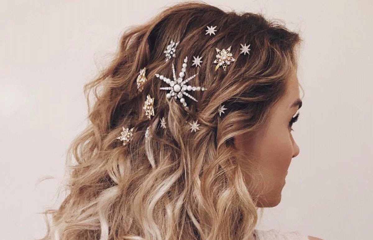 Короткие прядки подберите спереди при помощи заколок со снежинками или камнями.