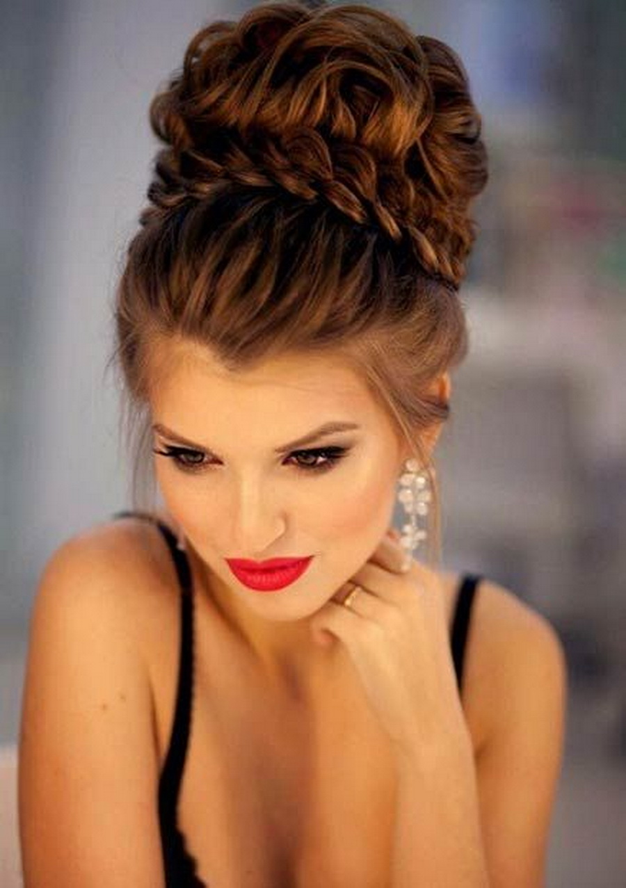 Такую укладку нельзя назвать простой, зато она очень эффектна на вид и точно произведёт фурор на праздничной вечеринке. Спереди из небольшого количества локонов формируют начёс, закрепляют заколкой. Из остальных локонов делают шишку, вокруг которой причудливо изгибают передние пряди. Для надёжности волосы фиксируют невидимками.