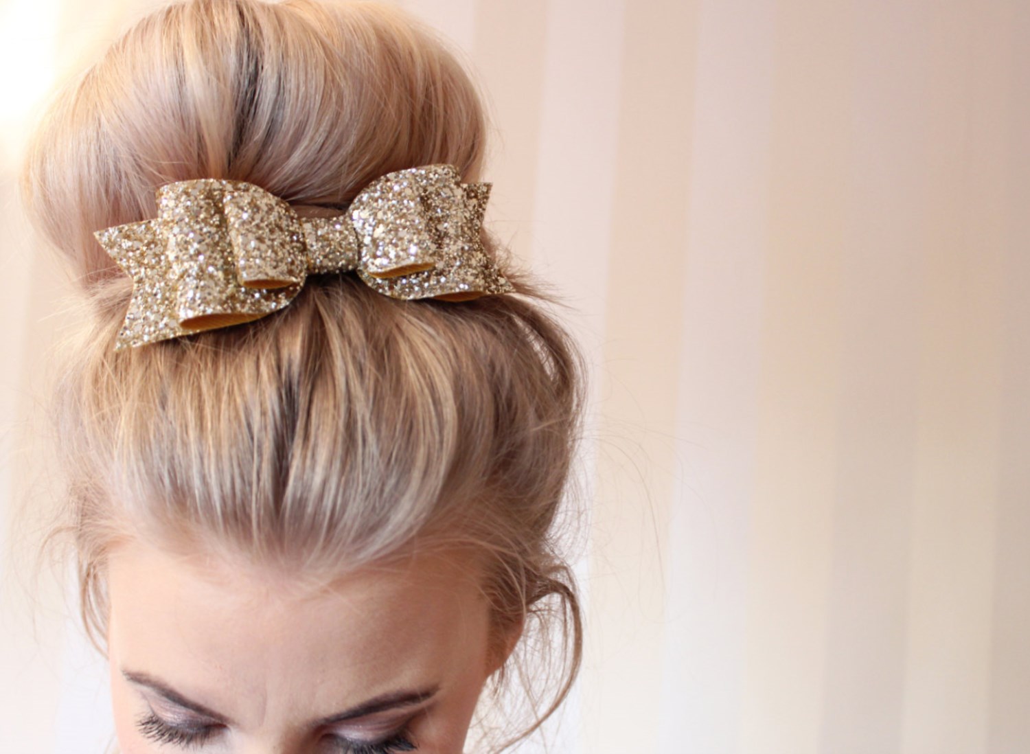 Очаровательный бант тоже можно без особых проблем создать самостоятельно, без посещения салона красоты. Потребуются резинка и невидимки. На макушке формируют хвост, не вынимая волосы до конца. Получившуюся петлю делят на две части и закрепляют в виде банка невидимками.