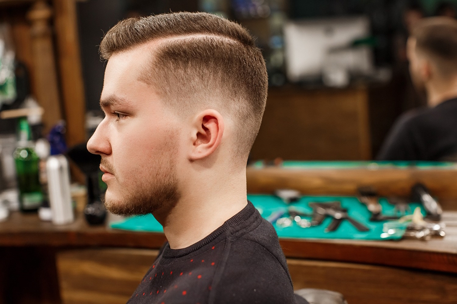 Стрижка помогает не только замаскировать поредение в височной зоне, но и сформировать образ успешного мужчины. В данном случае пряди на висках стригутся максимально коротко, в то время как волосы сверху остаются достаточно длинными, чтобы сделать пробор сбоку. Эффектность стрижки напрямую зависит от навыков стилиста. Образ успешного джентльмена нельзя доверять любителю.