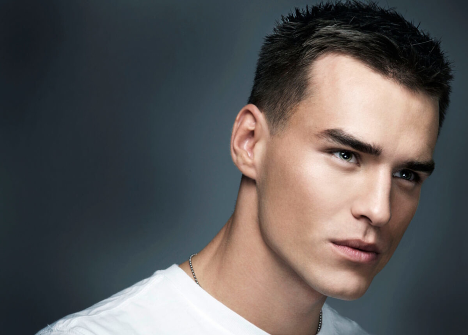 Обладателям жестких волос идеально подойдет модель стрижки ежик. Длину волос регулирует мастер, учитывая форму лица и особенности волос, главное условие — это филировка прядей и хаотичная укладка с торчащими прядями во все стороны. Визуально прическа должна напоминать иголки у ежика, благодаря такой укладке скрываются зоны с залысинами.