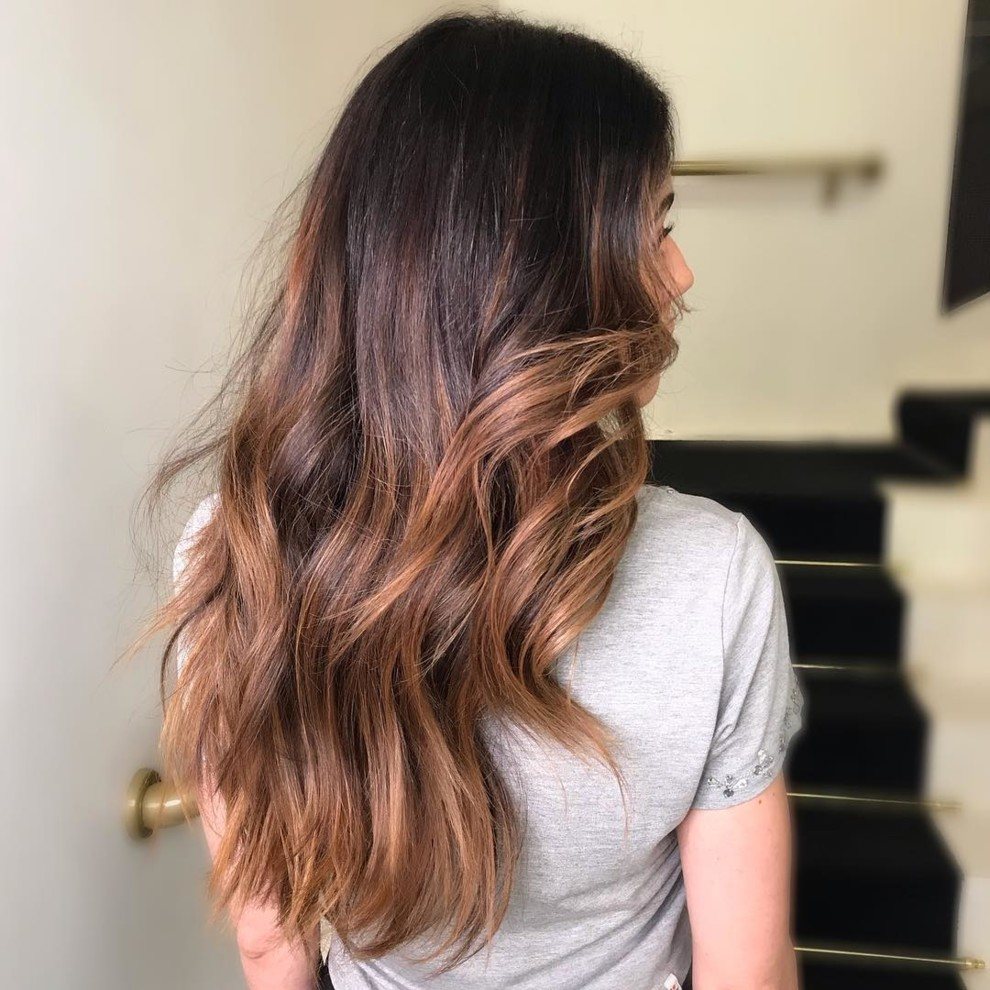 Балаяж на темные волосы с медными оттенками, фото