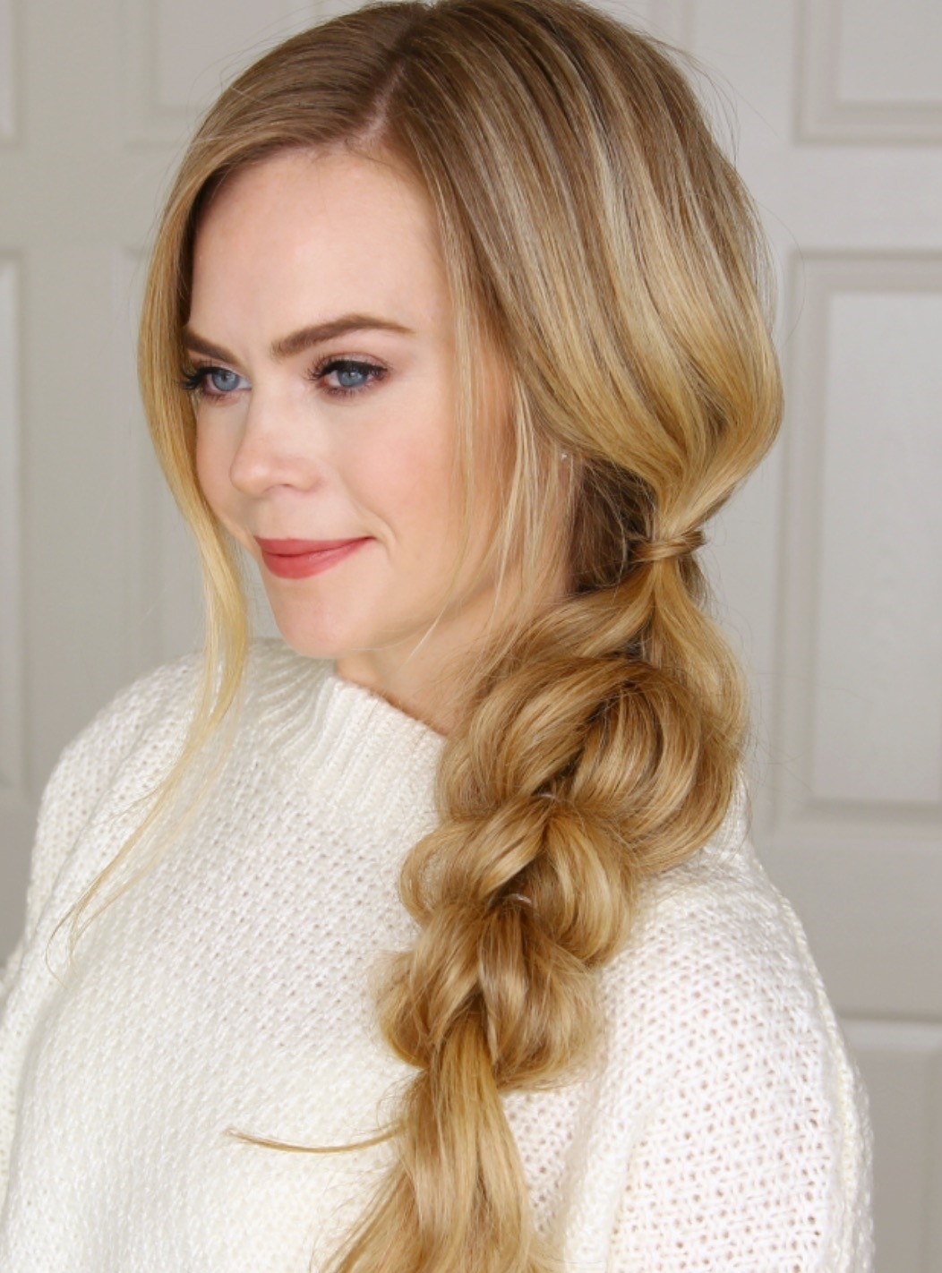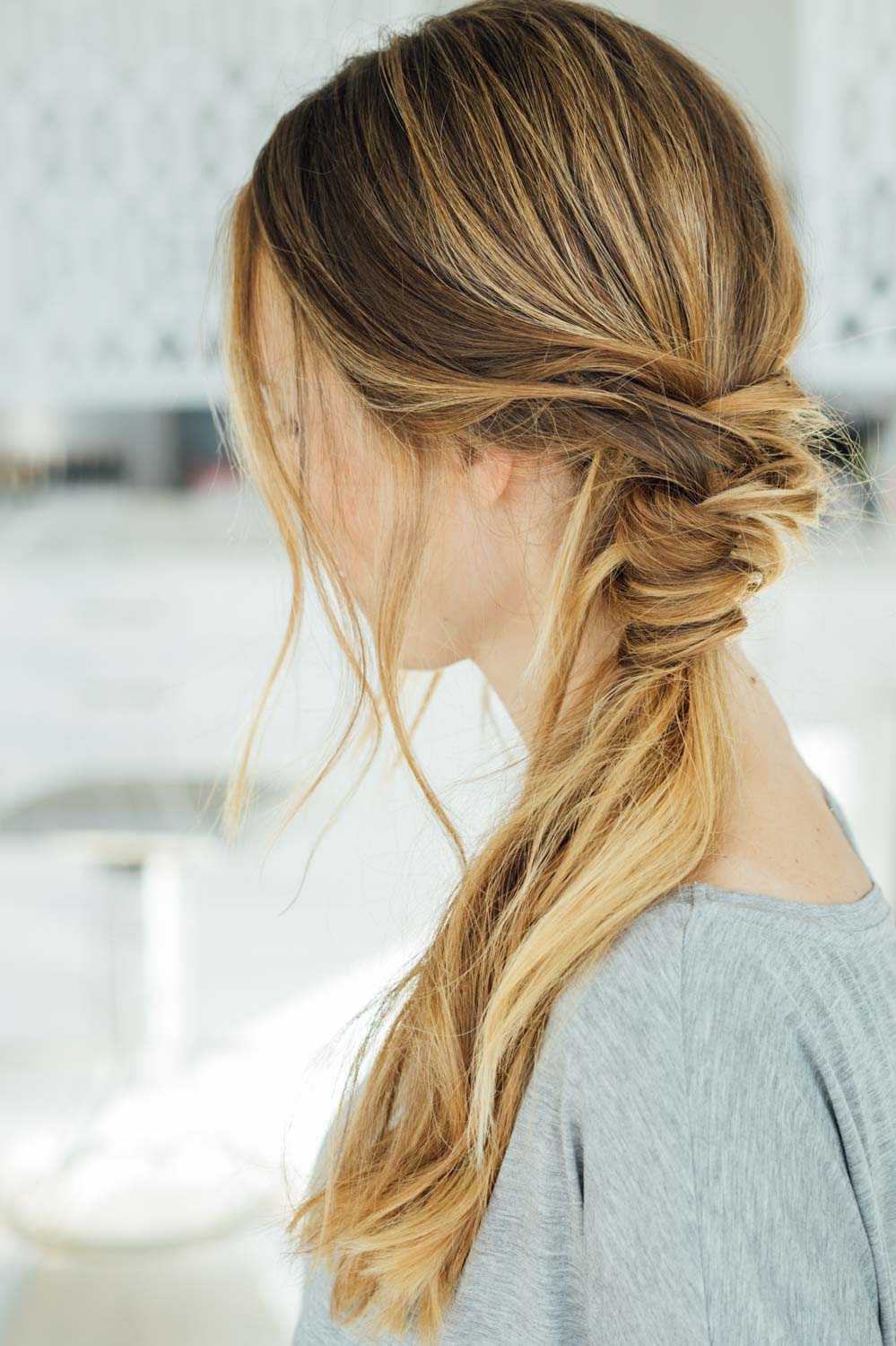 - Перекидывают все волосы с одной стороны так, чтобы они легли на плечо.