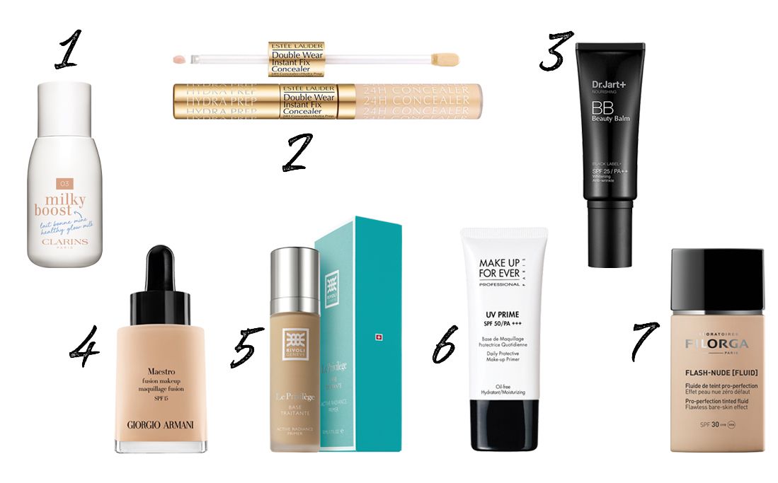1 — oттеночный флюид для лица Milky Boost, Clarins, 2 — Консилер + праймер для лицa Double Wear Instant Fix Concealer 24H Concealer, Estee Lauder, 3 — питательный BB-крем Black Label, Dr.Jart, 4 — тональная вуаль Maestro Fusion Make-Up, Giorgio Armani, 5 — cредство 4 в 1 Le Privilege, Rivoli, 6 — увлажняющая база под макияж Make Up For Ever, 7 — тональный флюид Flash-Nude, Filorga
