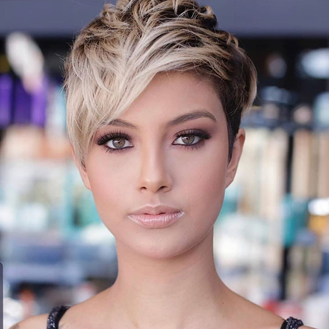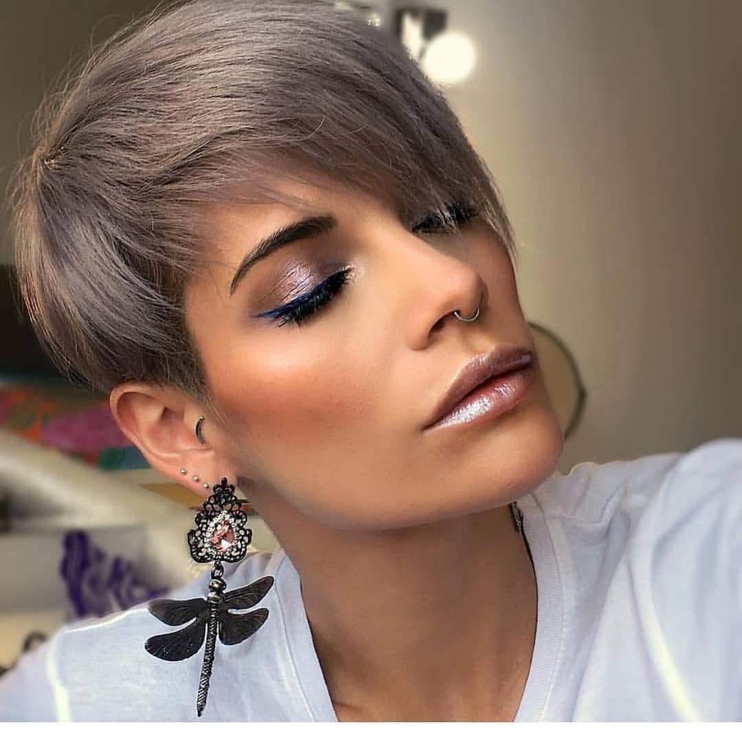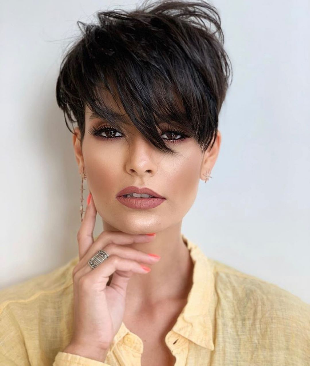 Пикси дополняют ультракороткой челкой, оставляющей лицо практически открытым или напротив, удлиненной челкой, которую при необходимости можно зачесать назад и зафиксировать стайлинговыми средствами.