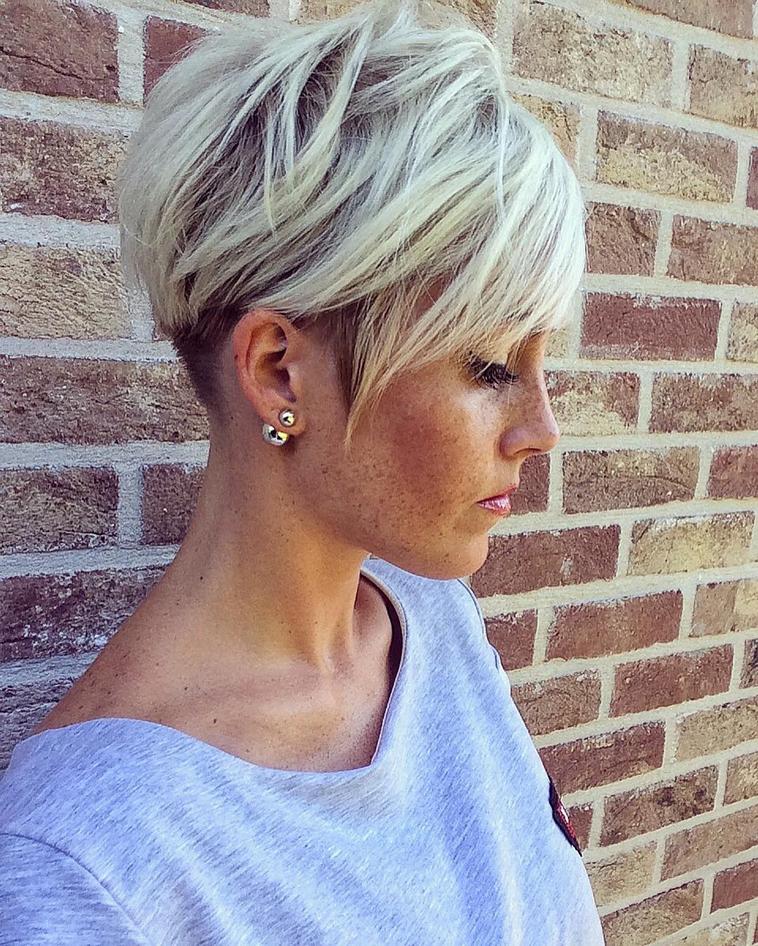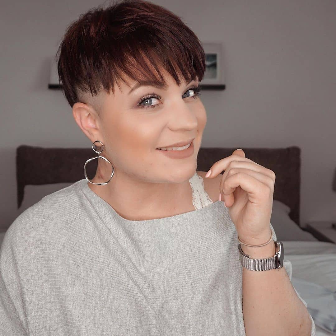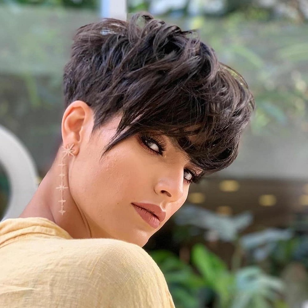 Пикси дополняют ультракороткой челкой, оставляющей лицо практически открытым или напротив, удлиненной челкой, которую при необходимости можно зачесать назад и зафиксировать стайлинговыми средствами.