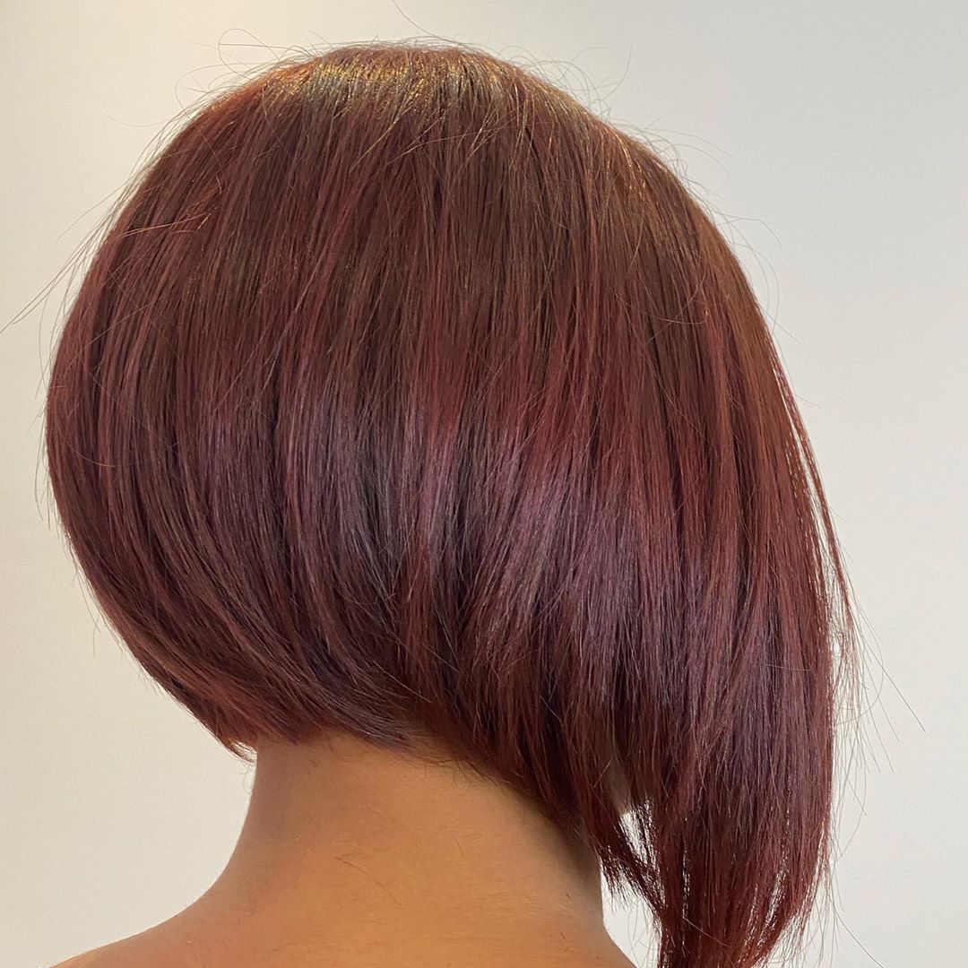 Асимметричный боб предлагается подчеркнуть косой челкой, спадающей на одну сторону. Этот прием дополнительно подчеркивает асимметрию и делает на ней акцент.
