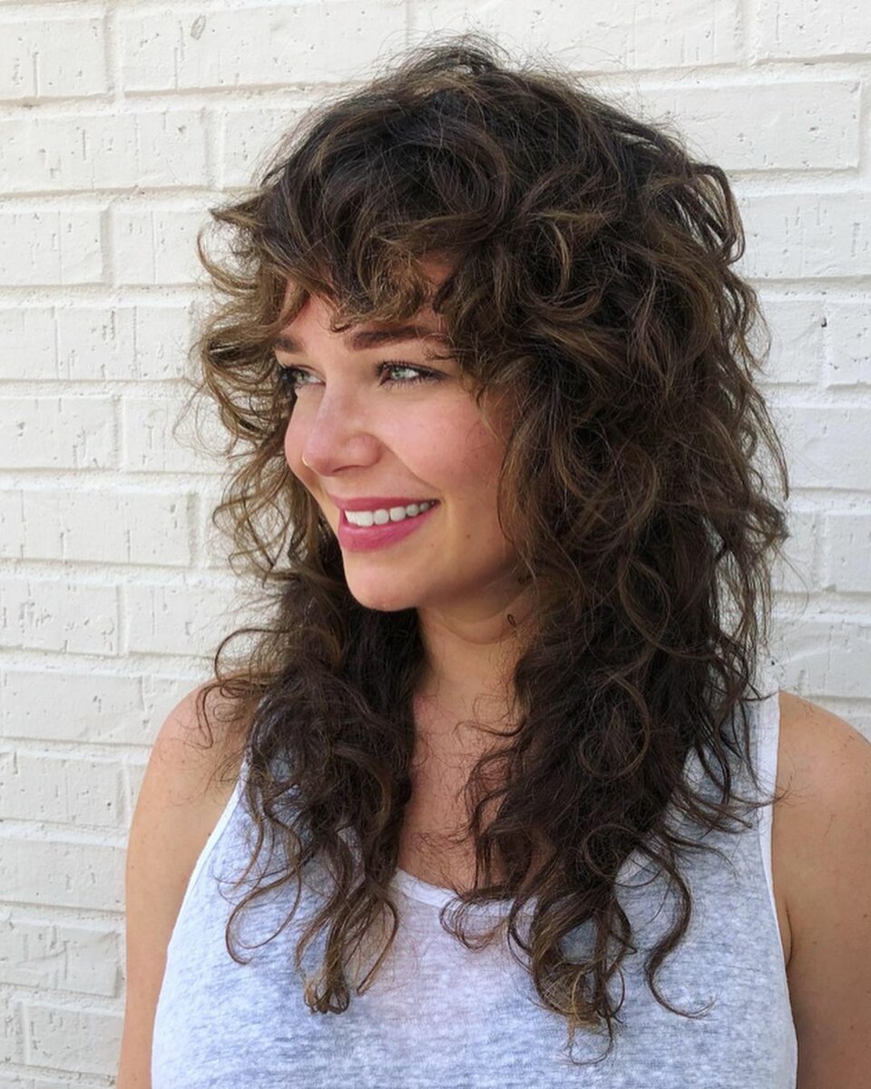- Длинная асимметричная челка отлично смотрится с вьющимися волосами. Это один из лучших вариантов, потому что текстура объемная и подвижная.