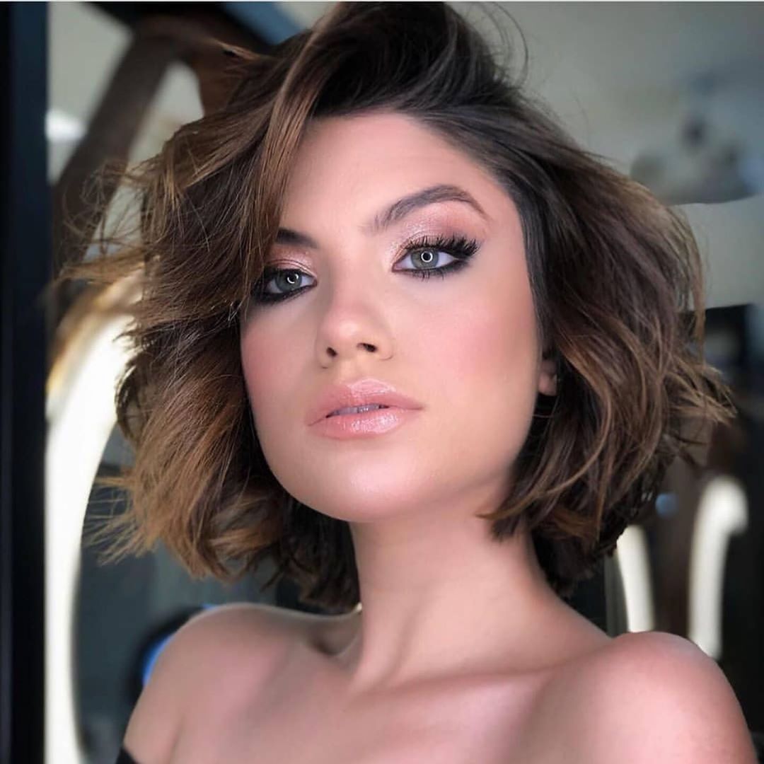 Челка неплохо сочетается с вьющимися, слегка непослушными средними волосами и обеспечивает девушке возможность превосходно выглядеть в любой ситуации