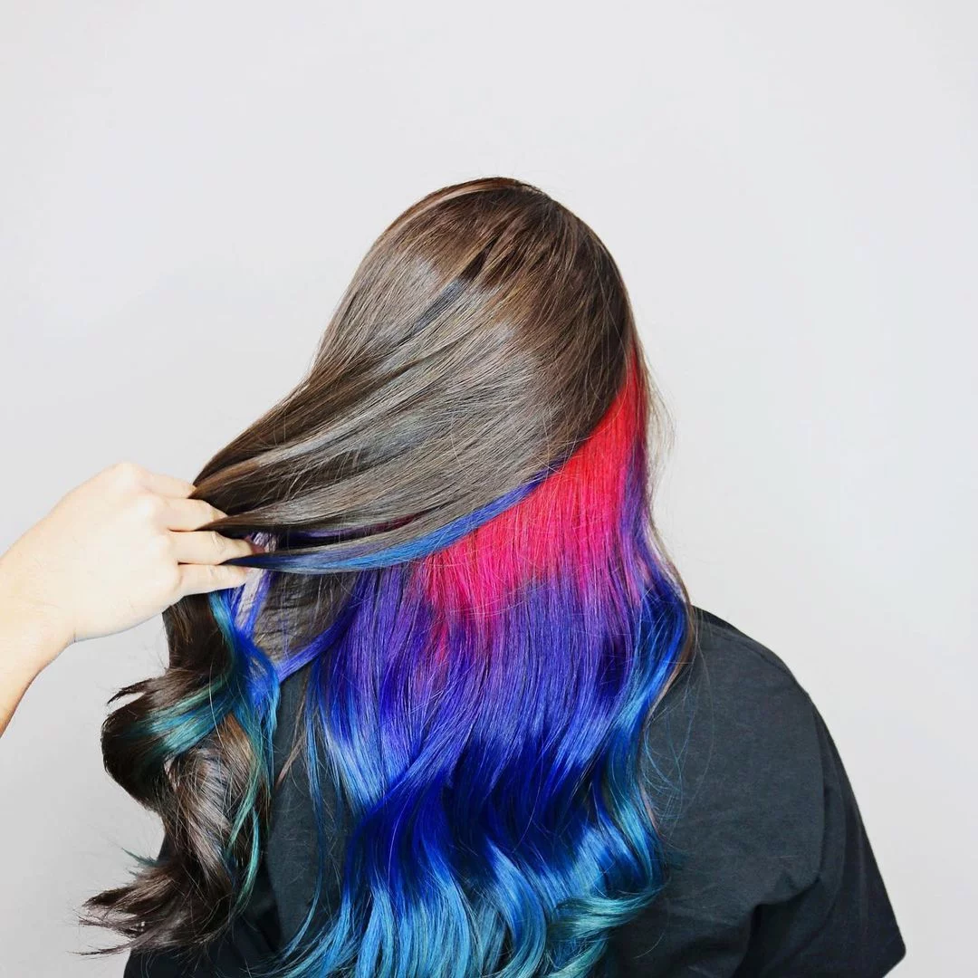 Скрытое окрашивание — универсальный вариант смены имиджа для обладательниц волос самых разных цветов и длины. Достаточно изменить укладку или позволить волосам развеваться по ветру, как потайные пряди заиграют яркими красками. Выбирать цвет волос и технику окрашивания лучше, исходя из цветотипа внешности девушки и длины волос.