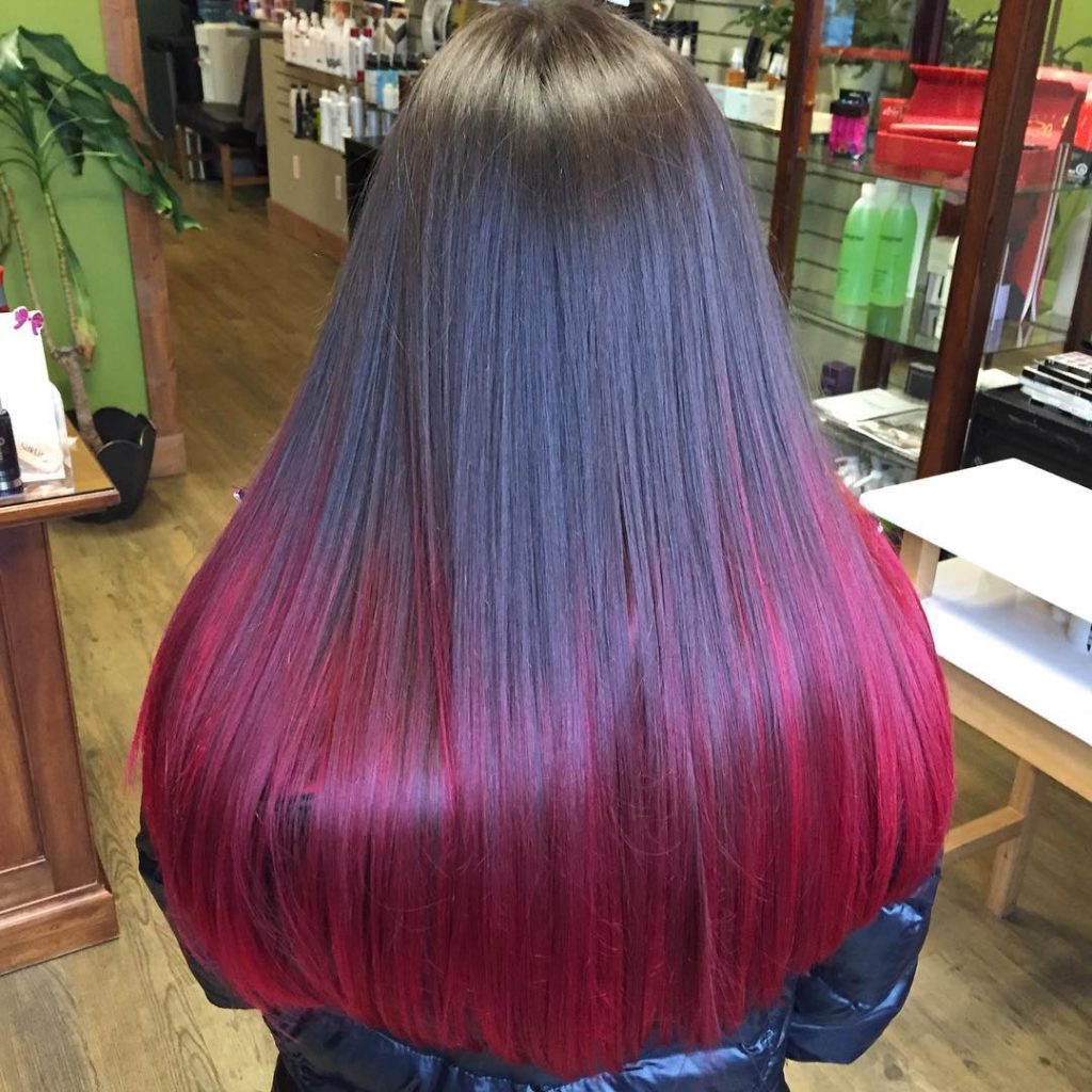 Черная часть обычно находится на корнях, а красная часть распространяется по длине прядей. Черная часть цвета может имеет разные оттенки, например, она темная или более светлая.