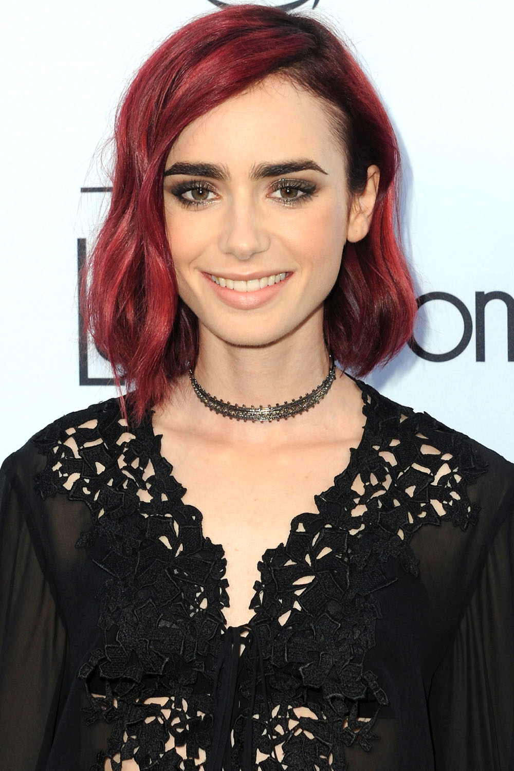 натуральный черный с переходом в бургунди на примере Лили Коллинз;