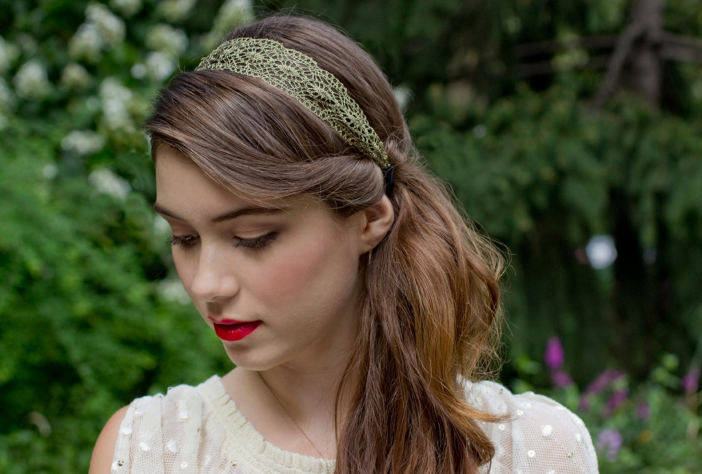 Выбирайте повязку из кружева и надевайте ее максимально горизонтально, приподняв сзади к макушке. Челку предварительно разделите надвое прямым или косым пробором.