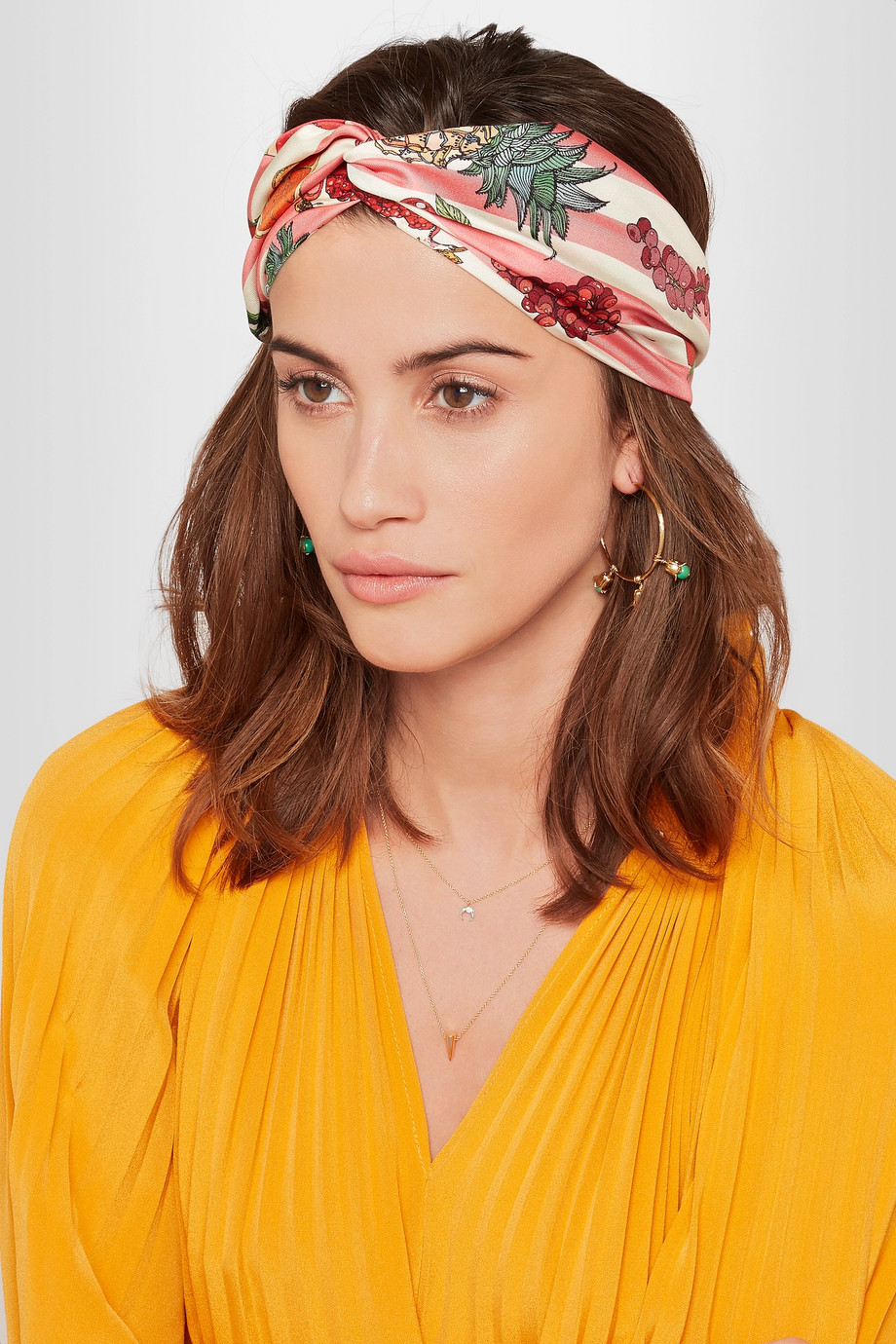 Пшеничный цвет волос будет подчёркиваться подобранным в тон аксессуаром. Также модное решение — компоновать чалму с блестящими темными локонами, заплетенными в небрежную косу. Такой восточный стиль не может оказаться незамеченным.