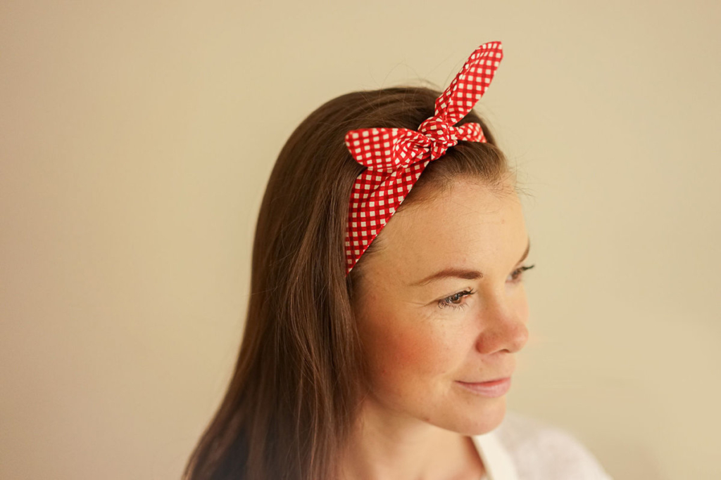 - Завяжите повязку от затылка ко лбу на кокетливый узелок, слегка сместив его вбок.