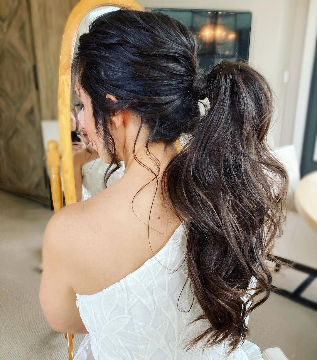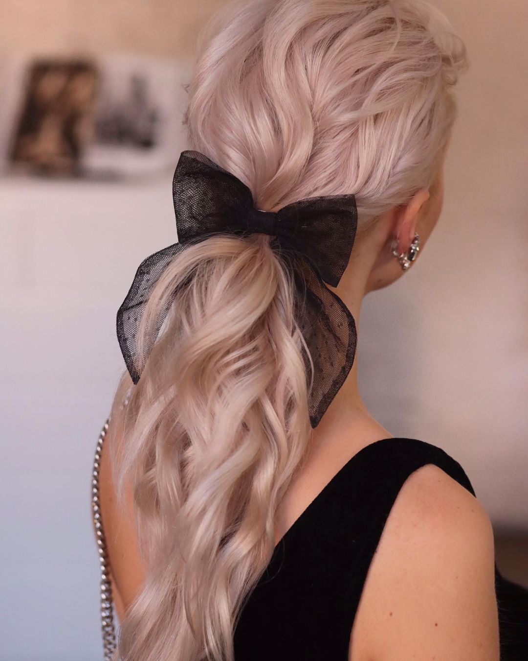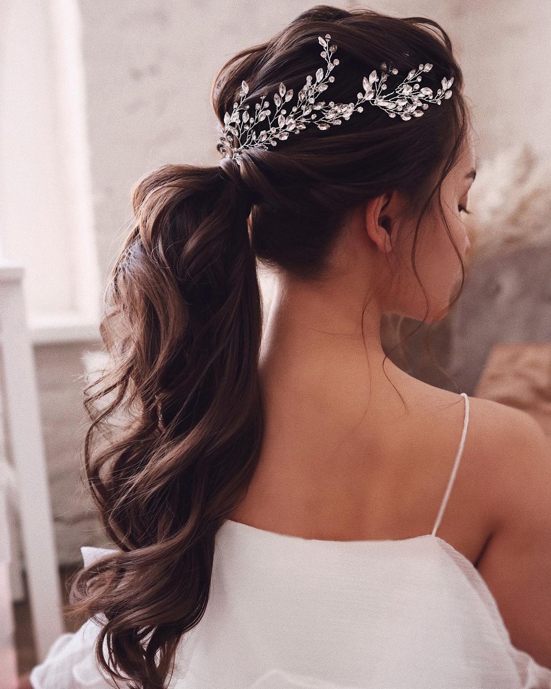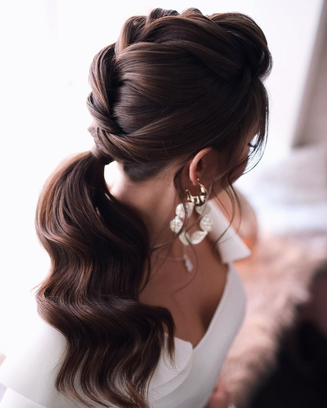 Такая прическа очень популярна и даже когда кажется, что это слишком просто для выпускного вечера, то нужно дополнить ее с помощи начеса спереди, или элементов плетения. Высокий кучерявый хвост отлично сочетается с обтягивающим платьем в пол.