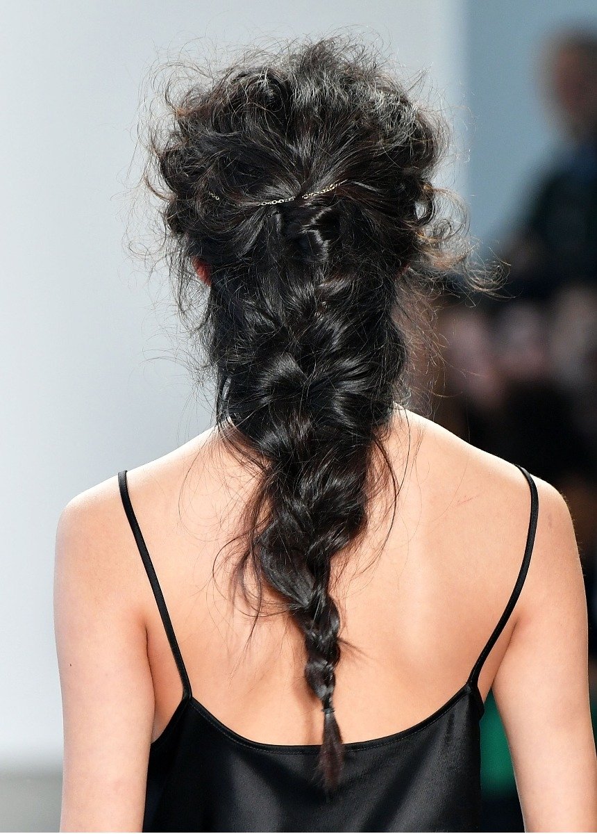 - Коса набок. Если волосы очень объемные и пышные, постоянно лезут в глаза, передние прядки можно убрать в косу. Для этого нужно нанести мусс на чуть влажные волосы, отделить передние пряди и плести косу набок, забирая все новые прядки по типу косички «колосок». Задние волосы остаются распущенными. Закрепить косу можно как невидимкой, так и эффектной заколкой.