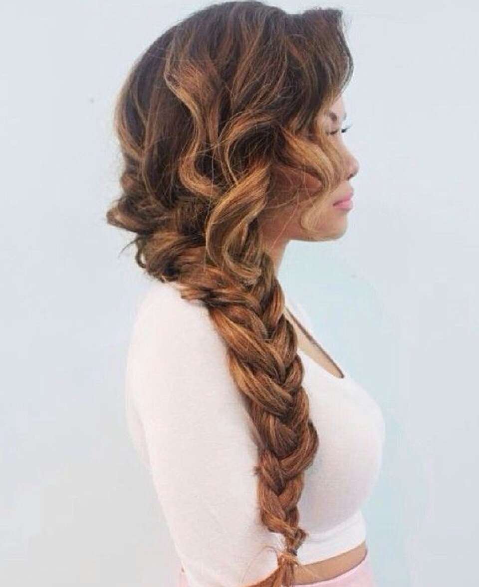 Заплести косу в рыбьем стиле можно не только прямые, но и волнистые волосы. Для этого отделяют пряди с каждого бока со стороны висков, захватывая завитки со лба. Плетут обычные косички до середины головы, когда они встретятся их соединяют в одну, крепят жемчужной заколкой. Опускаются вниз, берут пряди возле ушей, вновь плетут косы до точки соединения. Концы от верхнего плетения продевают под второе крепление.