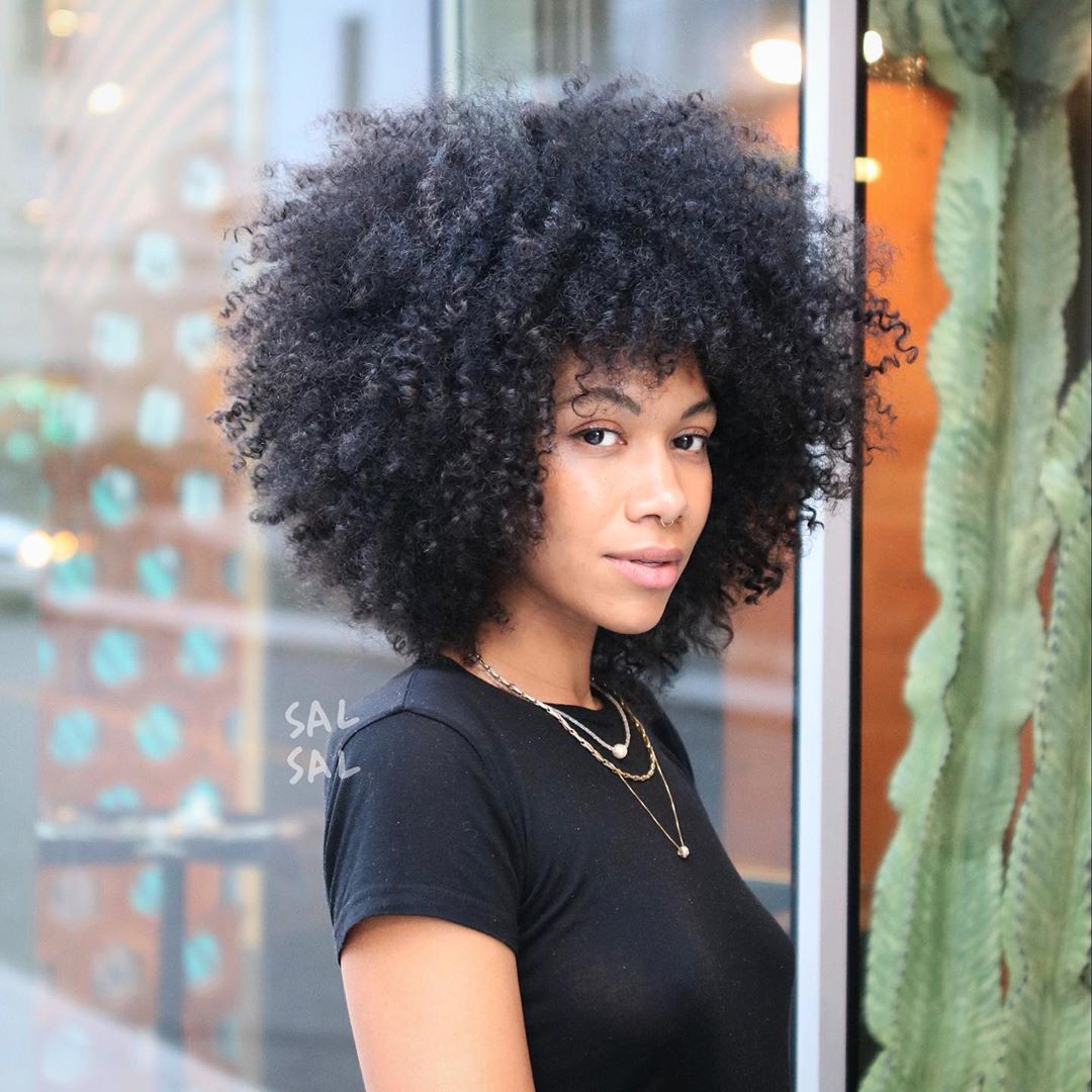 - Афро-стиль. Это прическа, в которой кудри расположены близко друг к другу, создавая густой объем на голове. Она обычно делается на кудрявых волосах естественной кудрявости и является ярким проявлением индивидуальности.