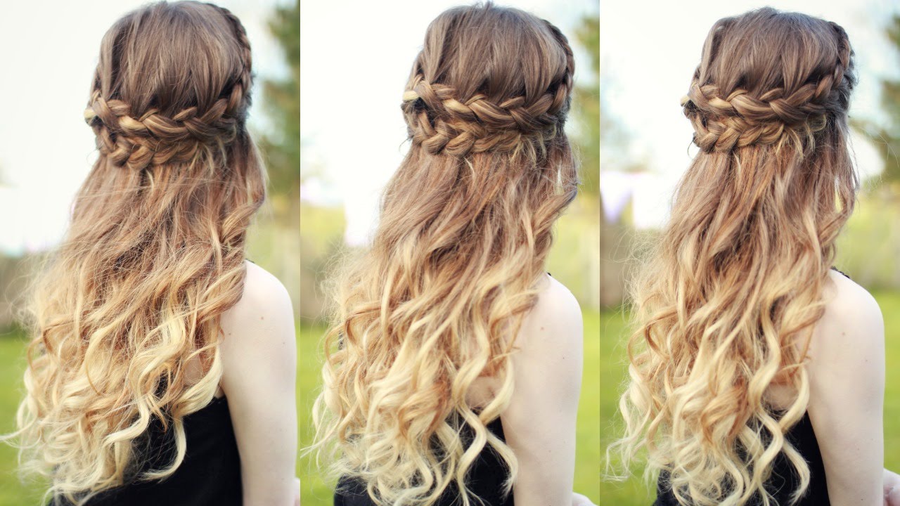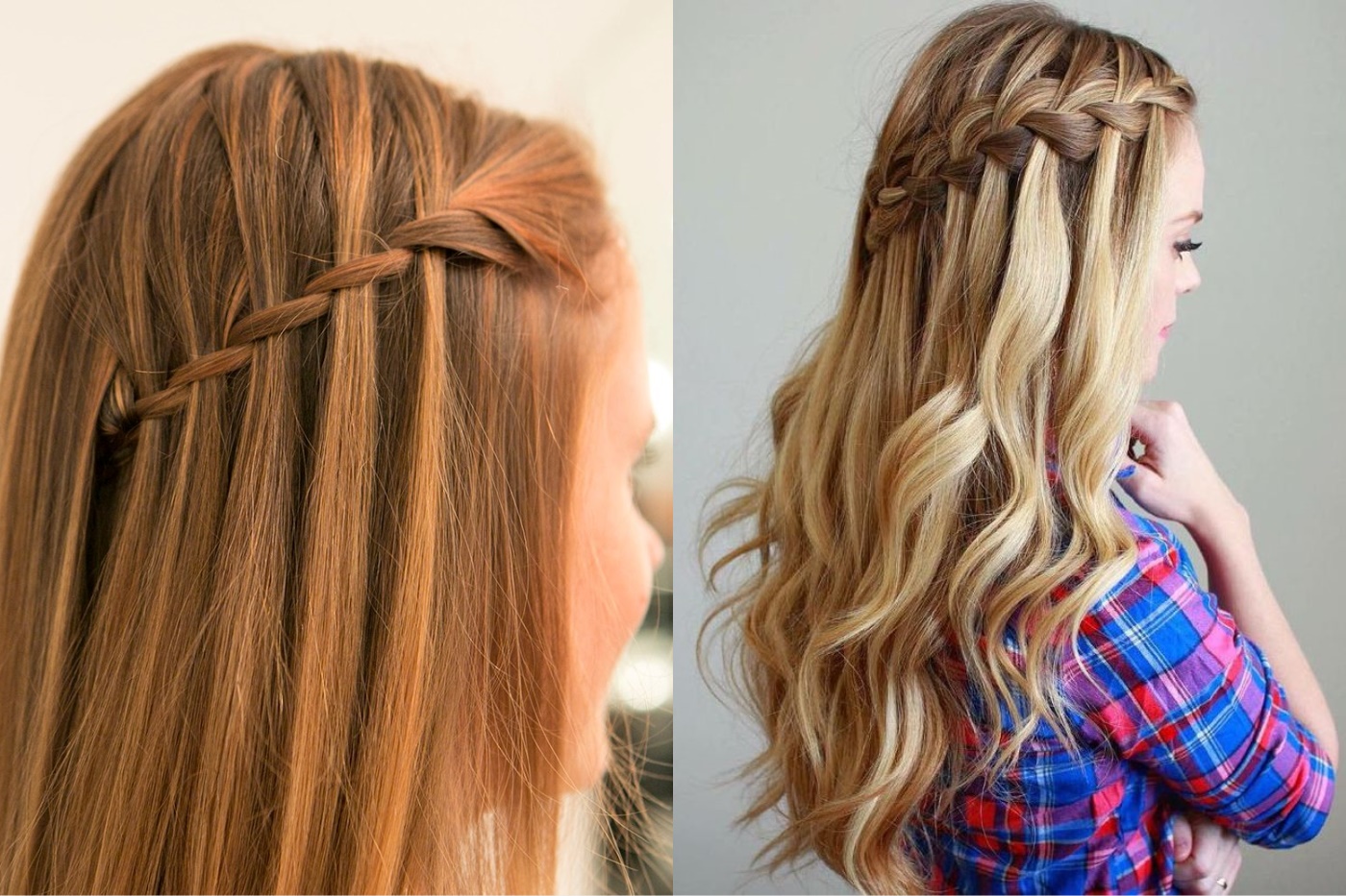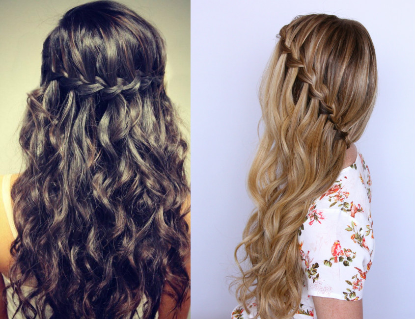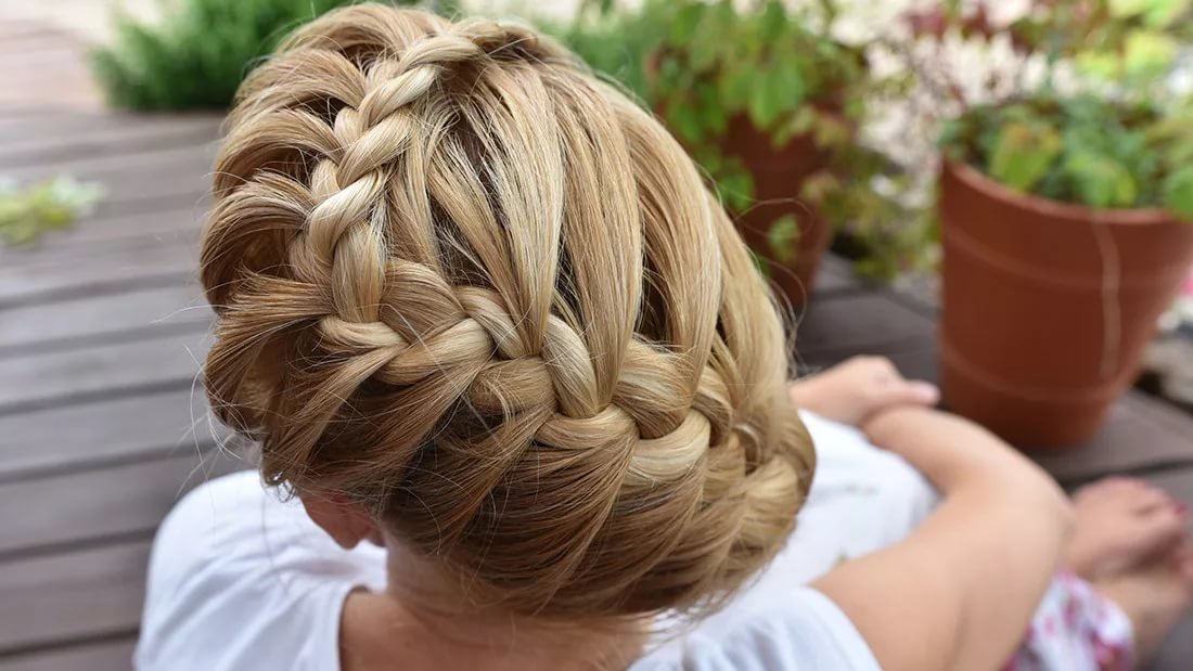 «Струящийся водопад» — такая укладка выглядит нежно, бесподобно, восхитительно и идеально подходит на выпускной. Учтите, волосы должны быть длинными. Сделайте косой пробор, а концы подкрутите на крупные бигуди, плойку, утюжок. Выделите несколько прядей в области лба и сплетите небольшую косу вокруг головы. Такие же действия проделайте с другой стороны пробора. Обе косы уложите и зафиксируйте.
