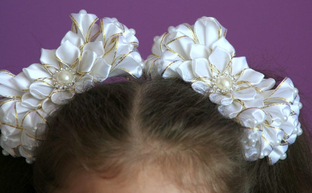 Родителям девочек можно привлечь свою фантазию, чтобы прическа ребенка получилась яркой и красивой. Как вариант, использовать белоснежные банты, шёлковые резинки, маленькие крабики или множество резиночек.