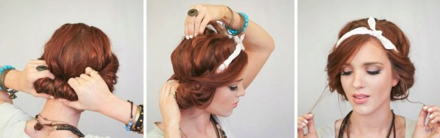 Если волосы короткие, их моют и сушат естественным способом, допускается небрежная растрепанность в сочетании со стайлинговыми средствами мягкой фиксации. Лоб можно повязать лентой или платком на манер чалмы.