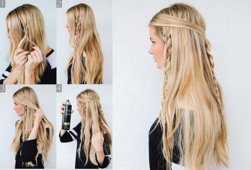 - Заплетите две косички поверх основных волос справа и слева и, начиная от макушки, заплетите центральную косу поверх остальных.