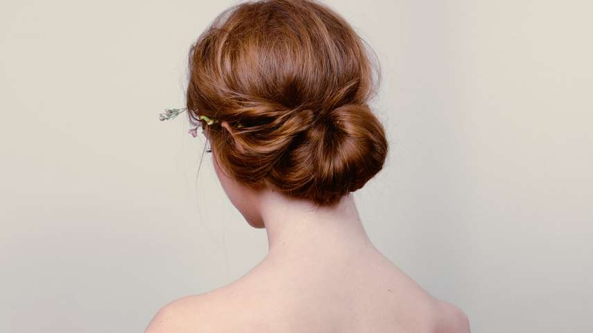 Соберите низкий хвост, отделите над ним прядь. Заплетите ее косой, а затем выложите над хвостом по кругу в виде цветка, закрепите невидимками.