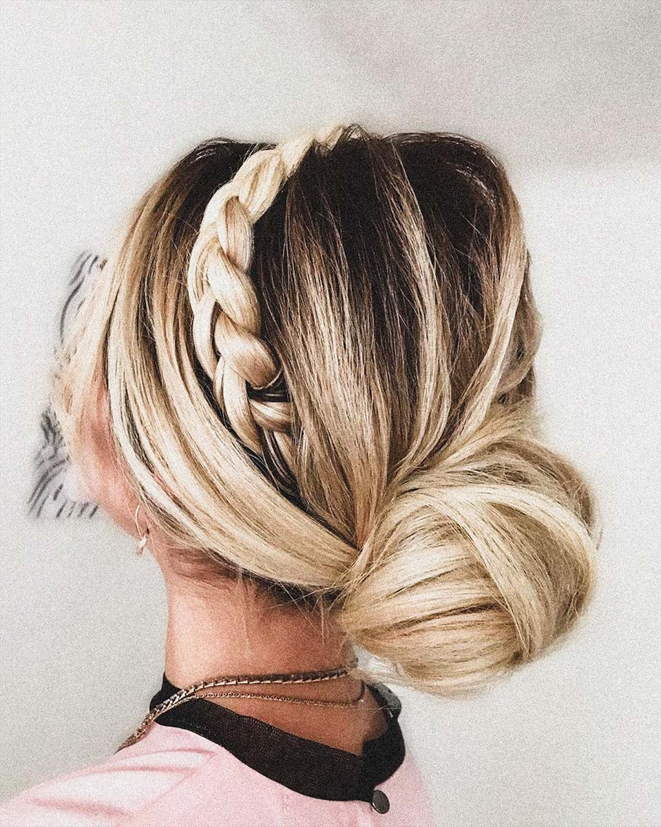 - Далее сформируйте из косички пучок, зафиксировав его шпильками или оставив в первозданном виде.