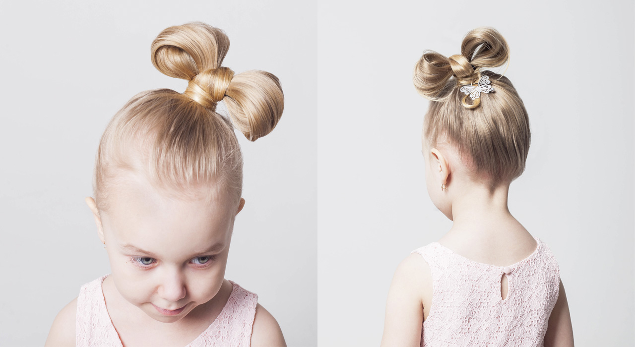 Бантик (поделите петлю надвое, а концы проложите между двумя получившимися петлями, зафиксировав их на обе стороны; закрепите концы волос невидимкой).