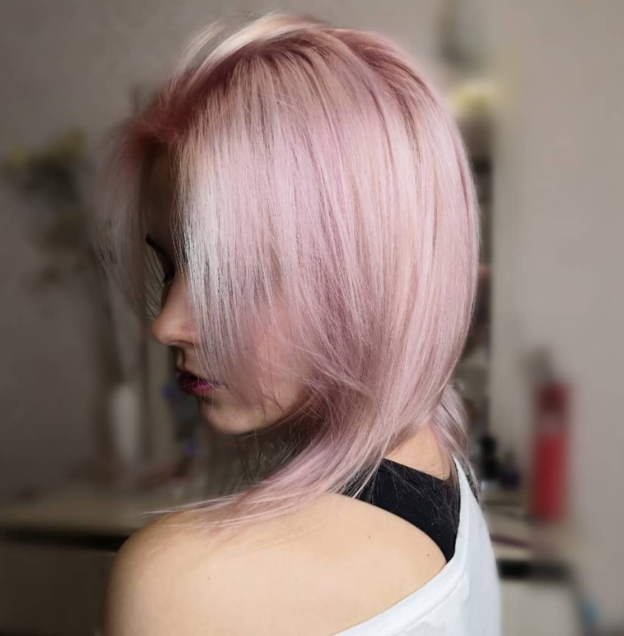 Исходя из предложенных вариантов оттенков серо-розовых волос, можно с лёгкостью догадаться, что перед окрашиванием прядей придётся их осветлить. Но в некоторых случаях можно оставить и тёмные волосы, а отступив расстояние от корней, выполнить окрашивание.