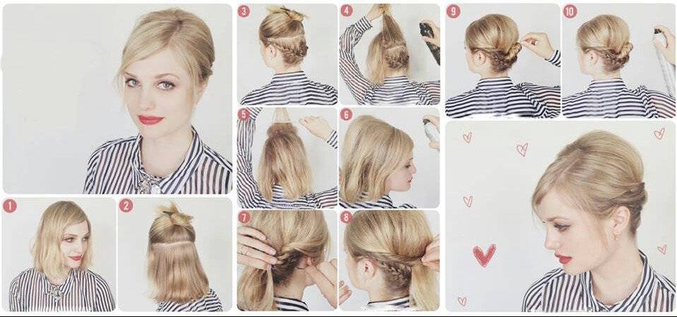 Чтобы создать иллюзию сложной укладки мы можем сделать пошагово с фото причёску на короткие волосы в домашних условиях: