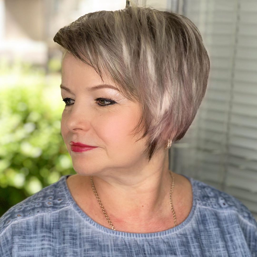 Женщинам старше 60 лет, особенно с волнистыми волосами, которые хотят не требующую ухода стрижку, подойдет боб со смешанными слоями. Окрашивание светлых волос также поможет вашему естественному седому окрашиванию.
