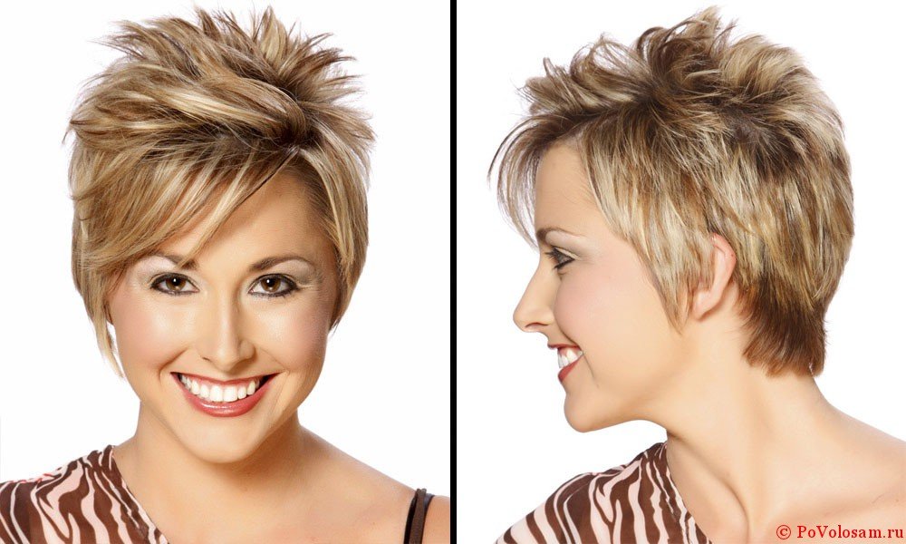 6) Можно уложить короткую шевелюру и при помощи утюжка, предварительно дав ей возможность высохнуть естественным путем. Далее надо нанести на голову средство для укладки с эффектом термозащиты. Затем каждую прядку, начиная с области затылка, надо вытянуть аккуратно от корней к кончикам. Использование утюжка позволяет локоны не только выпрямить, но и завить. Примеры готовых укладок, выполненных на коротких волосах, показаны на фото.