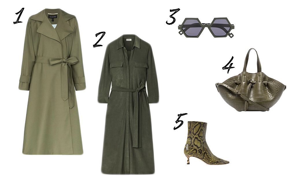 1 – тренч Anouki, 2 – платье L’agence, 3 – солнцезащитные очки Pawaka, 4 – сумка Nanushka, 5 – ботильоны Wandler