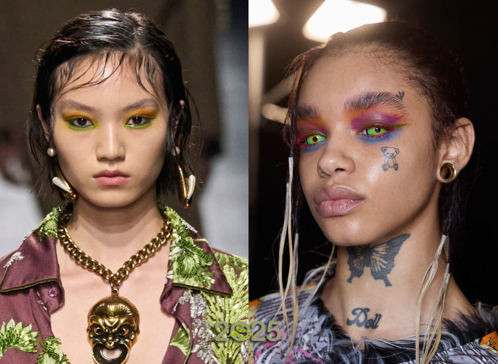 Если вы хотите создать яркий эпатажный образ, то присмотритесь к идее радужного макияжа от ETRO и DIESEL. Во втором случае эффект необычного оформления дополняют зеленые линзы.