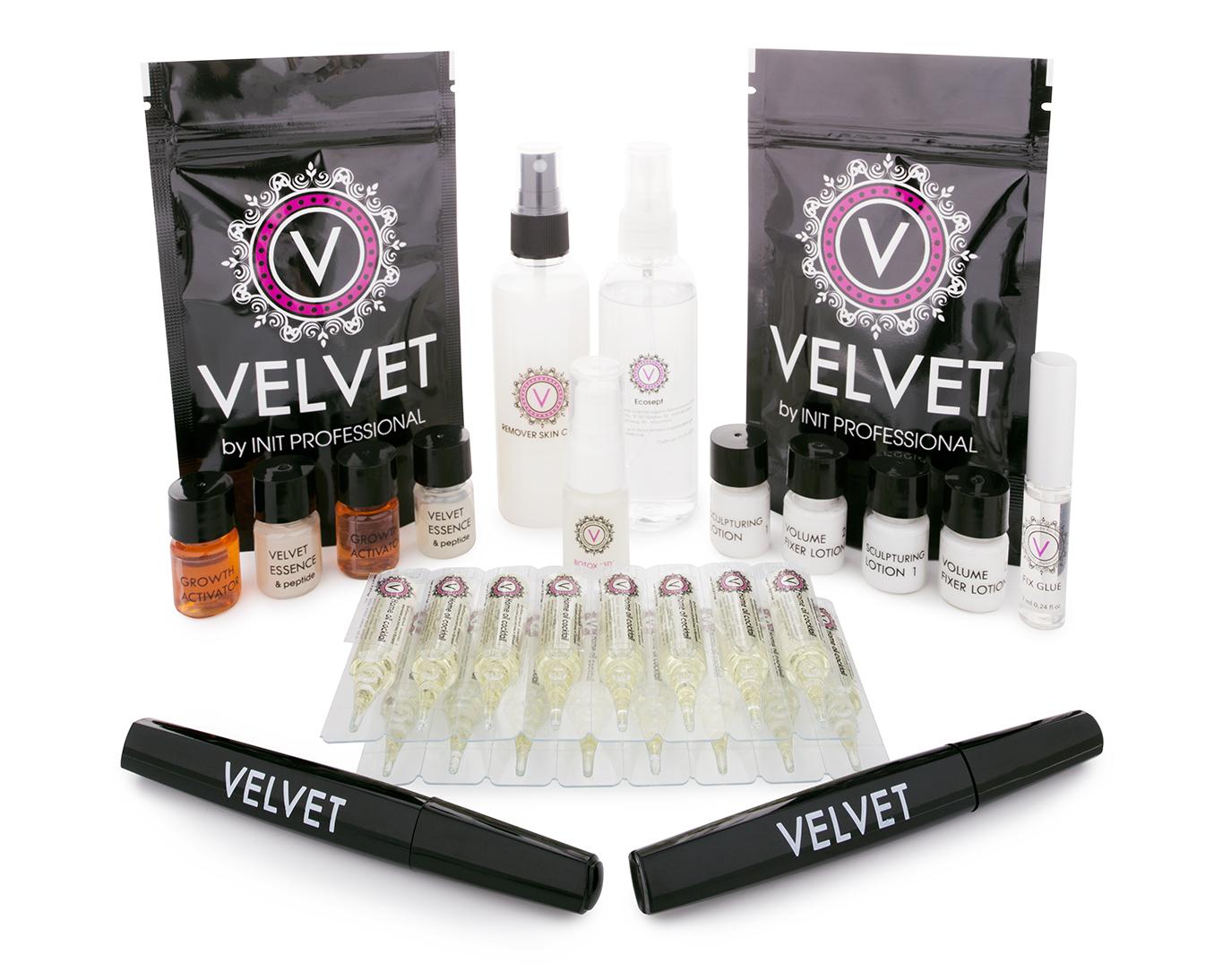 Состоит из четырех основных препаратов, лечебной туши Velvet, ремувера цвета, антисептика, геля-фиксатора, силиконовых форм в четырех вариантах размера, хны для окрашивания ресниц (в насыщенном черном оттенке), прямого пинцета, микробрашей, Botox 3D и 40 ампул фибриллярного препарата. Этот набор подходит для опытных мастеров реконструкции ресниц Velvet и лешмейкеров, которые начинают работу в индустрии дизайна взгляда.