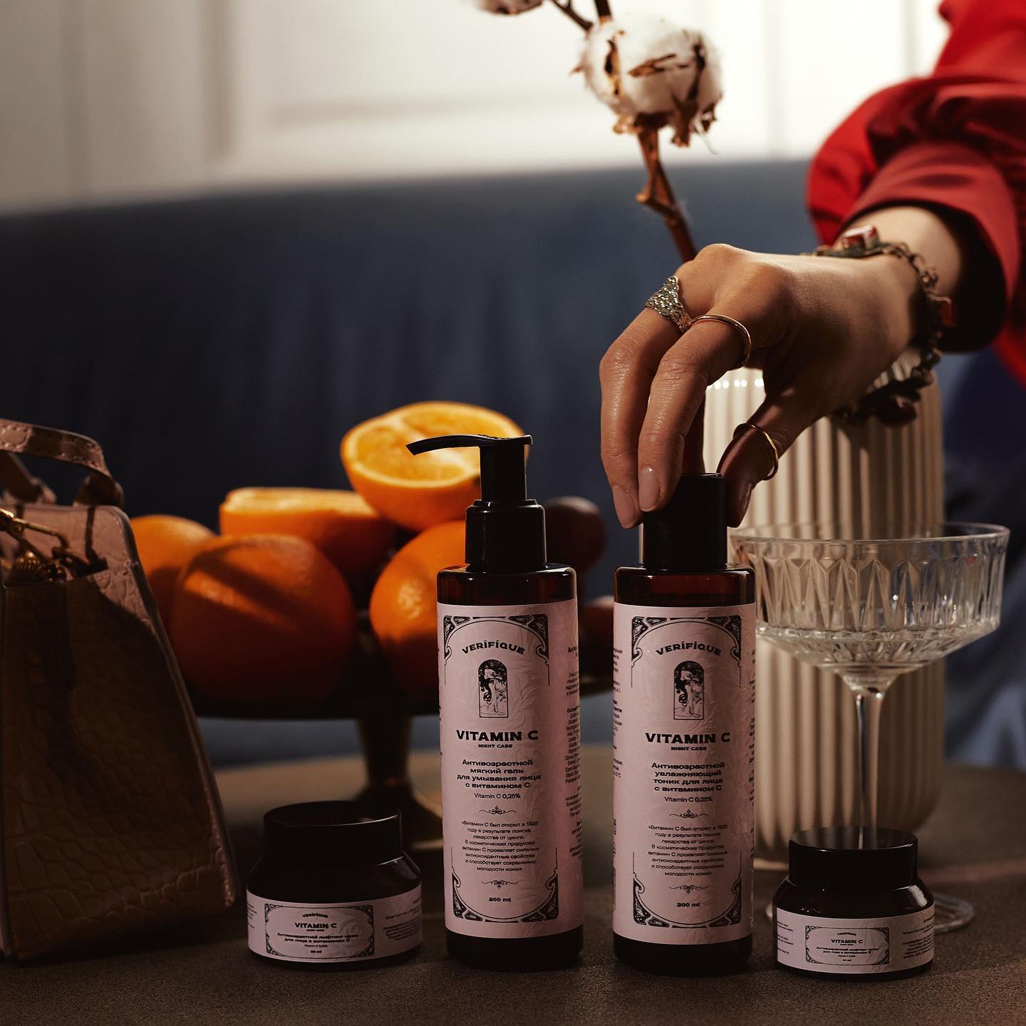 Средства с пептидом SYN-AKE обладают миорелаксирующим действием, подобным ботулотоксину. Грубо говоря, это вещество расслабляет мышцы лица и разглаживает кожу. Витамин А в составе продуктов бренда VERIFIQUE представлен в форме ретинола пальмитата, который можно и даже нужно использовать в летнее время года. Со слов Ксении, этот компонент обладает фотопротективным действием и даже разрешен к применению у беременных. Лифтинг крем с витамином С изготовлен на основе масел и обладает мощным антиоксидантный действием
