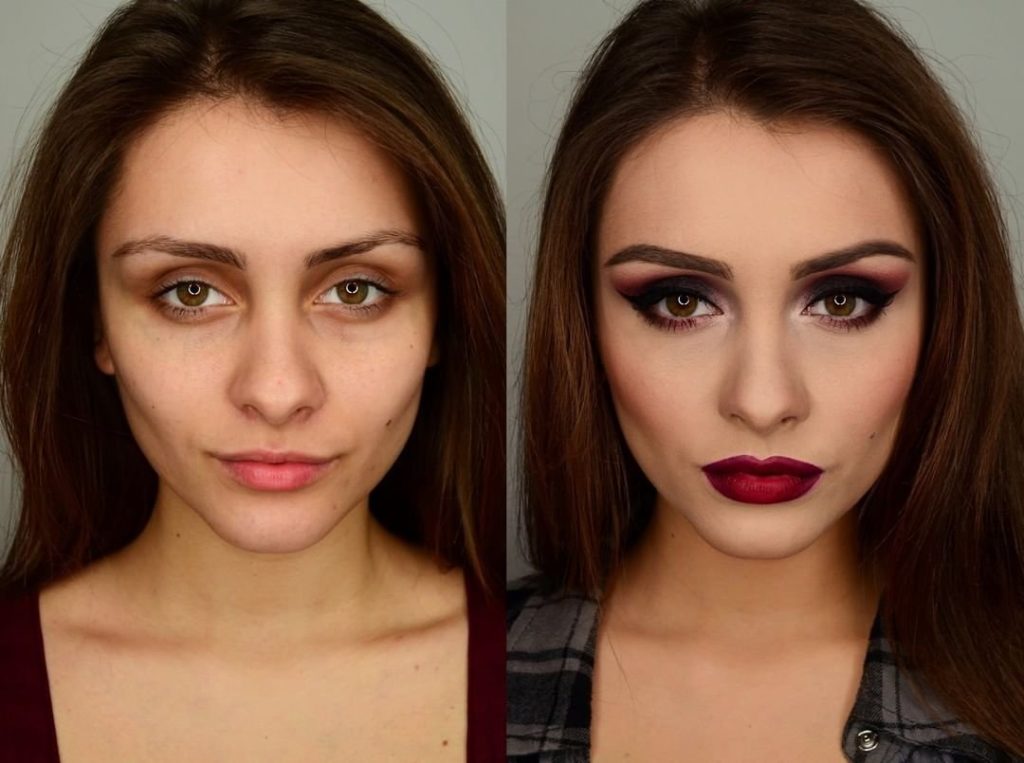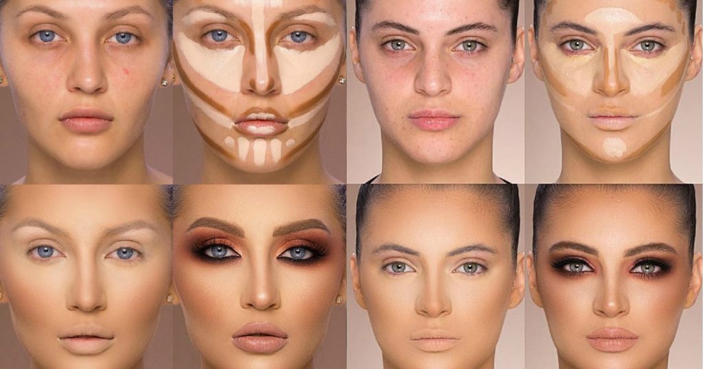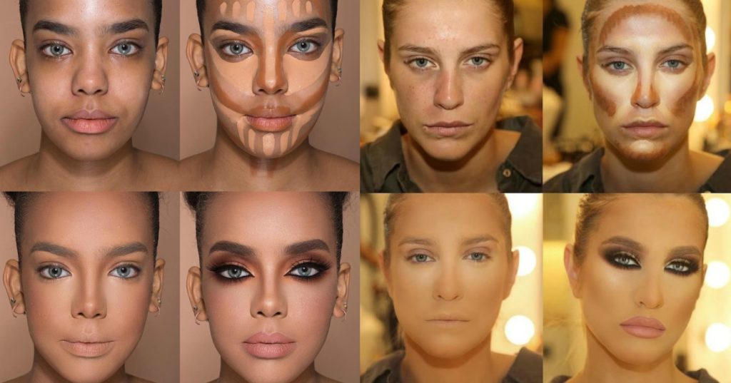 Фото примеров преображения «до и после» контуринга в интернете масса, особенно если фото без косметики сделано при слабом освещении, а кожа модели имеет неоднородный цвет. В этом случае нанесенные средства заметно преобразят, создав кукольный эффект. Однако не стоит ожидать от макияжа эффекта как от косметических процедур или пластики — он не убирает второй подбородок и не создает скулы, а лишь затемняет эти зоны.