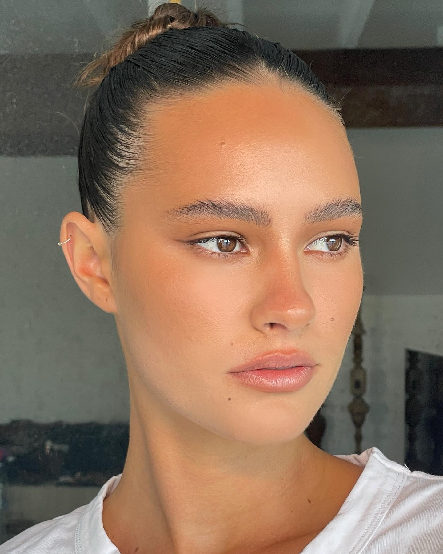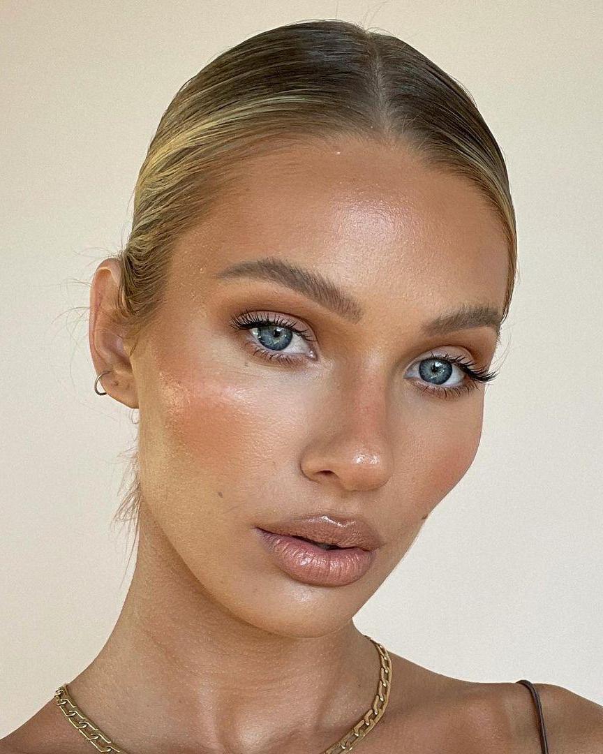 Еще один вариант летнего макияжа – это яркие губы, светящаяся кожа и широкие брови. Разберём поэтапно: