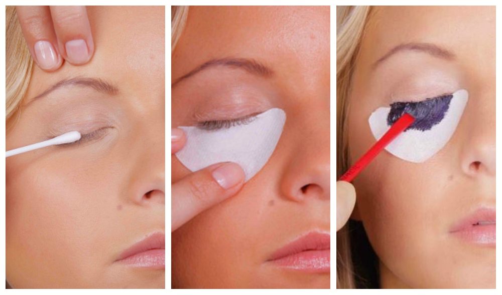 - чтобы не пачкать кожу, на нижние веки под линию роста подкладывают половинки ватного диска (или используют другую подложку);