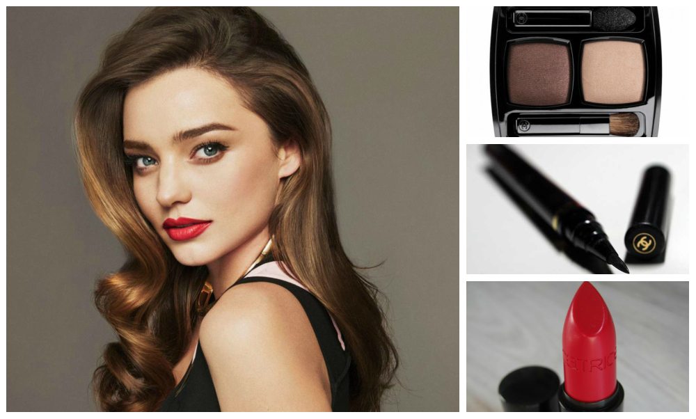«Фишка» вечернего мейк апа в стиле Miranda May Kerr- красная матовая помада. Помните, что матовые текстуры делают губки визуально тоньше, а потому если ваши губы тонкие от природы, замените матовую помаду на перламутровую. Макияж от этого не станет менее эффектным, но удачно подчеркнет вашу красоту. Для повторения образа модели вам понадобится: база под макияж, тональный крем, прозрачная пудра, румяна нежного персикового оттенка, хайлайтер, пудра со светоотражающими частицами, двухцветные тени: песочные и коричневые, черный лайнер и тушь, красная матовая помада.
