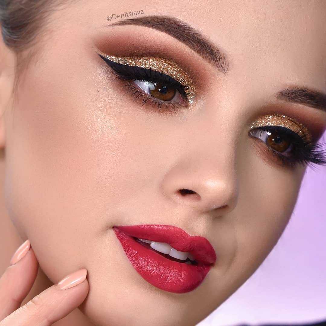 Губы можно смело накрасить алой или вишневой помадой. Сверкающий влажный эффект лучше создавать блеском малинового цвета. Коричневый и винный тон тоже остаются в тренде. Подробный обзор и фото макияжа на Новый год поможет создать незабываемый и чарующий образ милой дамы.