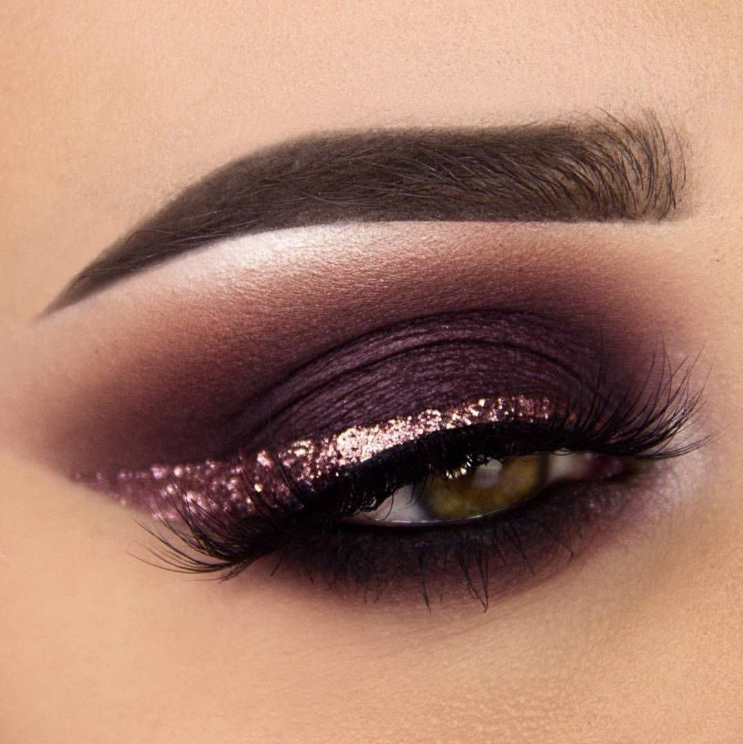 - Закрасьте слизистый контур глаза (сверху и снизу) при помощи черного карандаша или гелевой подводки. Нижнее веко подчеркните черными тенями и растушуйте границу с помощью коричневых матовых теней. Во внутренний уголок глаза и на подбровное пространство нанесите тени-хайлайтер. К слову, хайлайтер в этом макияже может быть достаточно активно блестящим.