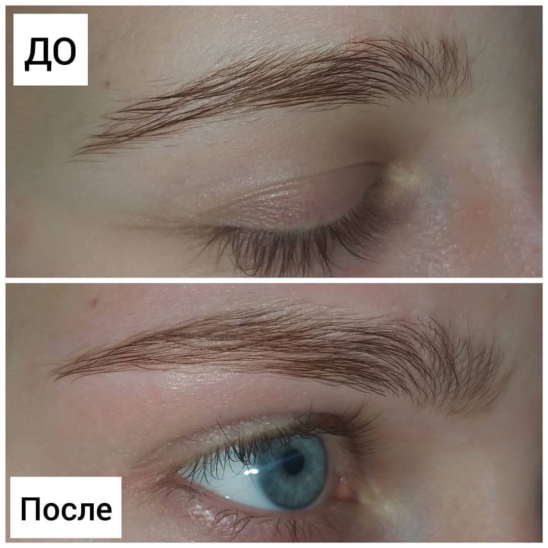 - Брови очищаются, обезжириваются, расчесываются. На данном этапе волоскам придают необходимую форму;