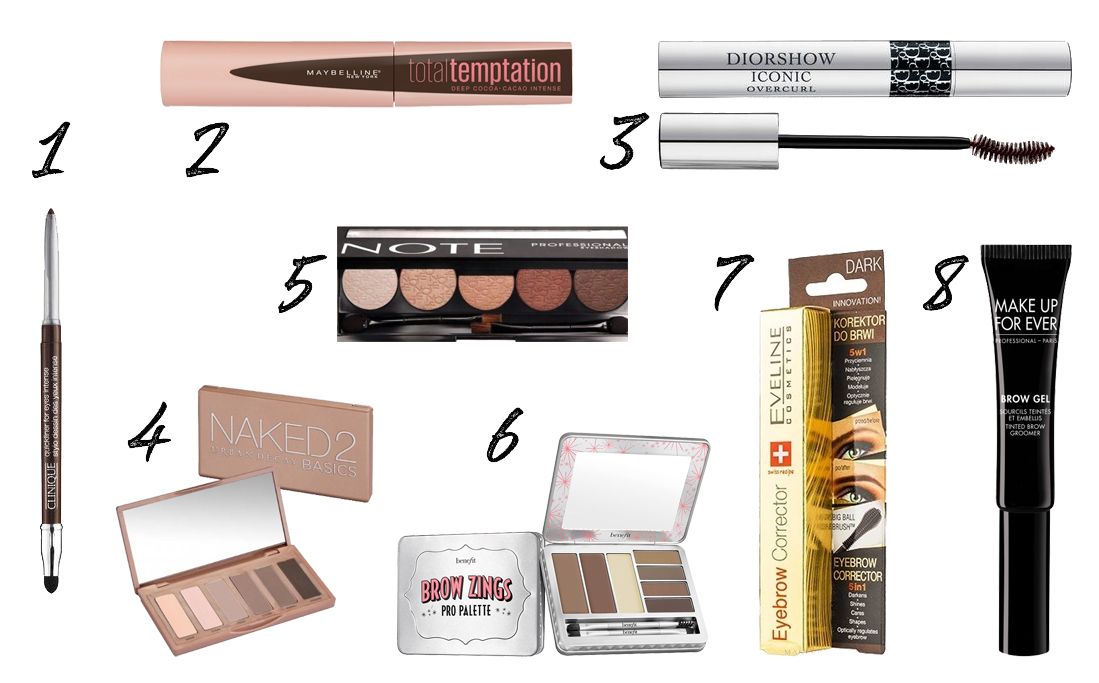 1 — карандаш для глаз с растушевкой Quickliner, Clinique, 2 — коричневая тушь для ресниц Total Temptation Mascara, Maybelline, 3 — тушь для объема и подкручиванмя ресниц Diorshow iconic, Dior, 4 — палетка теней Naked2, UrbanDecay, 5 — палетка теней NOTE, 6 — профессиональная палетка для зскульптурирования и придания бровям формы Brow Zings, Benefit, 7 — корректор для бровей Eveline Cosmetics, 8 — фиксирующий гель для бровей Make Up For Ever